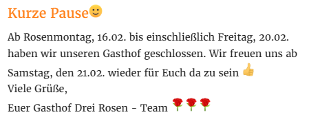 Besuchen Sie uns und fühlen Sie sich wohl im Gasthof „Drei Rosen“. Wir bieten Ihnen eine gut bürgerliche Küche in gemütlichen Räumen, passend für kleinere und größere Feierlichkeiten. Zur warmen Jahreszeit ist auch unsere neu gestaltete Terrasse äußerst beliebt. Informieren Sie sich einfach schon mal vorab über diese Seiten. Wir freuen uns auf Sie! Bis dann, Ihr „Drei Rosen“ - Team!